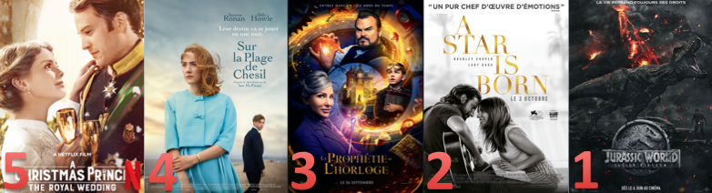 On commence avec les Flops, c’est à dire les films à éviter absolument ! En 5ème position, vous pouvez découvrir l’affiche du film Netflix A Christmas Prince : The Royal Wedding mais c’est en fait à tous les films de Noël estampillés Netflix que je pense car La Princesse de Chicago ou The Holiday Calendar ne sont pas bien mieux. Attention, l’année prochaine je risque de retourner au replay TF1 ou M6. Présenté à Cabourg et sorti durant l’été, Sur la plage de Chesil partait avec de sacrés avantages sur la papier (tiré d’un roman de Ian McEwan, avec Saoirse Ronan dans le rôle principal) mais le résultat est affligeant, la faute à un personnage principal masculin franchement pas futé. Avec La prophétie de l’horloge, Eli Roth s’attaque au film pour enfants. Changer de genre, pourquoi pas, mais encore faudrait-il le faire correctement. Car hormis les effets horrifiques maîtrisés, tout le reste est raté. Que sont allés faire Cate Blanchett et Jack Black dans cette galère ? Passons à A Star is Born, un film dont le succès à tendance à m’irriter quelque peu. On parlerait même de Bradley Cooper nommé aux Oscars dans la catégorie meilleur réal. Il manquerait plus que ça. Après un début plutôt réussi, le film enchaîne les clichés bien lourds pour finir dans une mer de pathos. Merci mais non merci. On termine avec Jurassic World Fallen Kingdom, qui remporte la palme cette année. La réal est ici plutôt correcte mais c’est le scénario, ridicule et, on peut le dire, pas bien poussé, qui agace. Le pire, c’est que la dernière scène nous emmène vers le pire prolongement de la saga possible. Je propose qu’on l’efface et qu’on recommence.