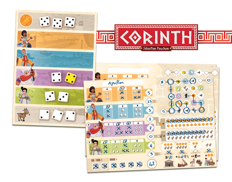 Vrai plaisir de joueur, le Roll & Play demande au joueur de se familiariser avec sa feuille (son plateau de jeu en somme) qu’il viendra griffonner au fil de la partie. C’est aussi un moyen simple de garder une trace de toutes les parties jouées. Welcome et désormais Corinth sont des jeux très faciles à sortir car ils plaisent à tous et c’est en grande partir grâce à cette mécanique de jeu.