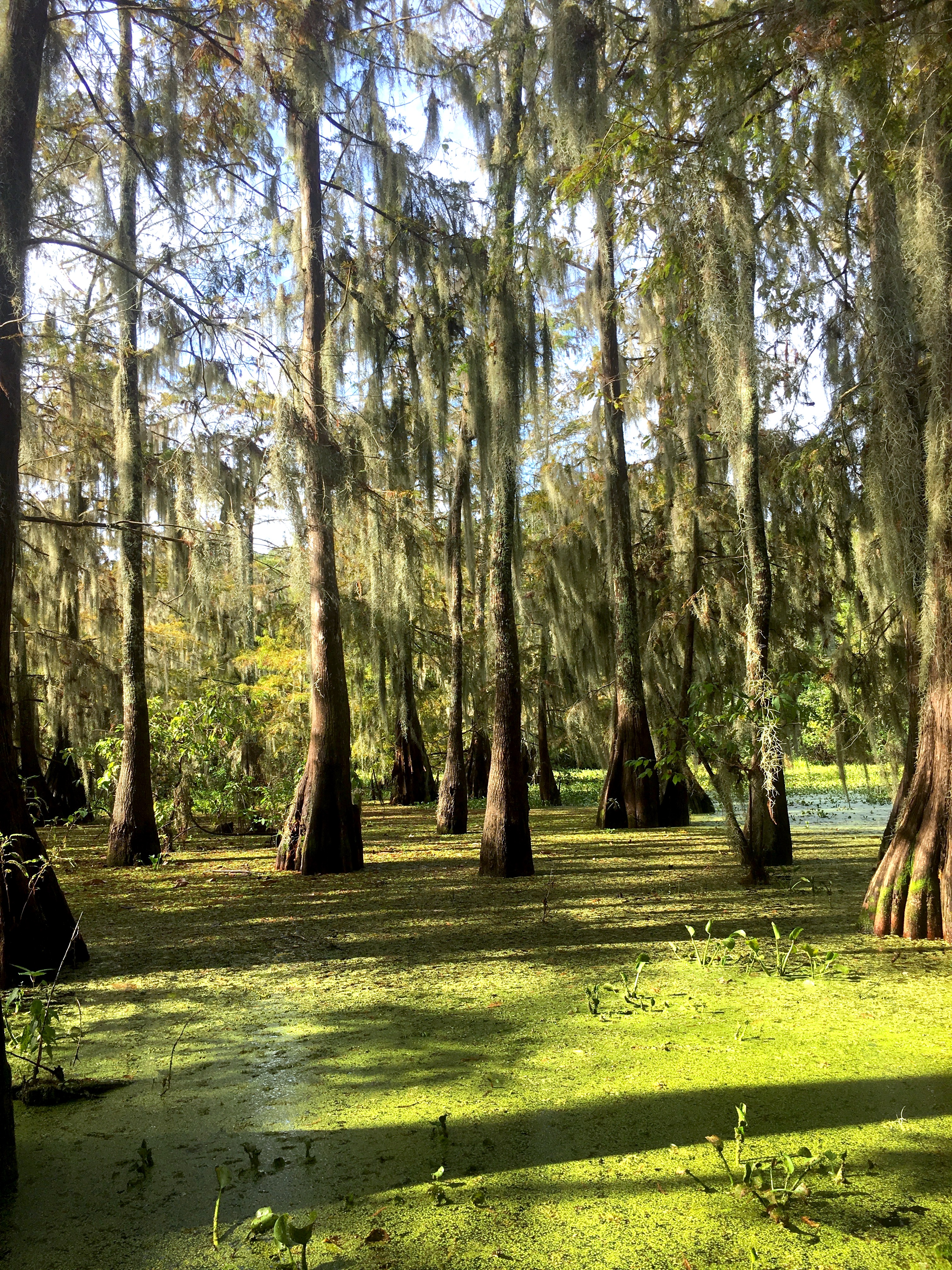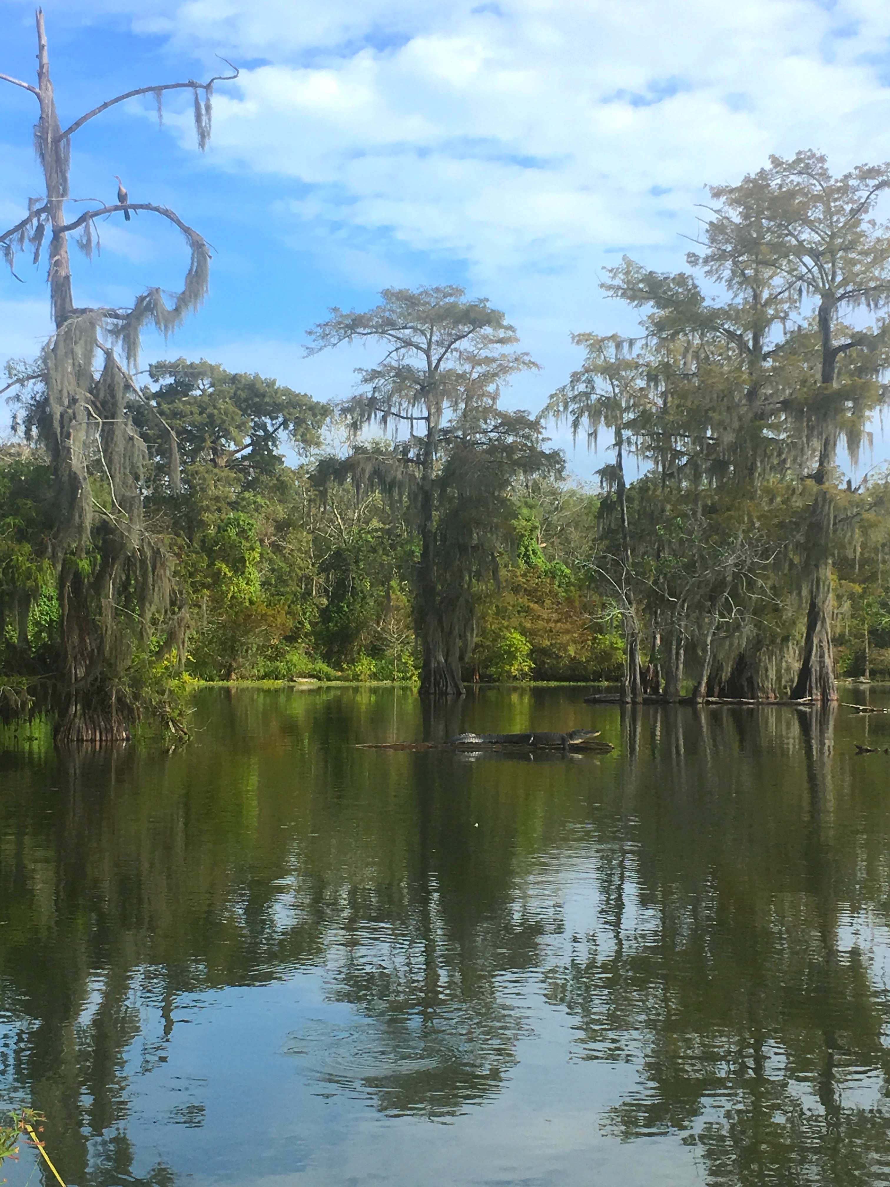 Après la ville et l’Histoire, un peu de nature, et quelle nature ! Les bayous sont ces fameux marais, qui définissent eux-aussi la Louisiane. Nous avons pu profiter de deux balades pour aller en admirer la faune et la flore. La première d’entre elle a eu lieu dans le bassin de l’Atchafallaya de très bonne heure. Nous étions seuls sur ces eaux et les mots m’ont manquée pendant de longues minutes tant le paysage était incroyable.