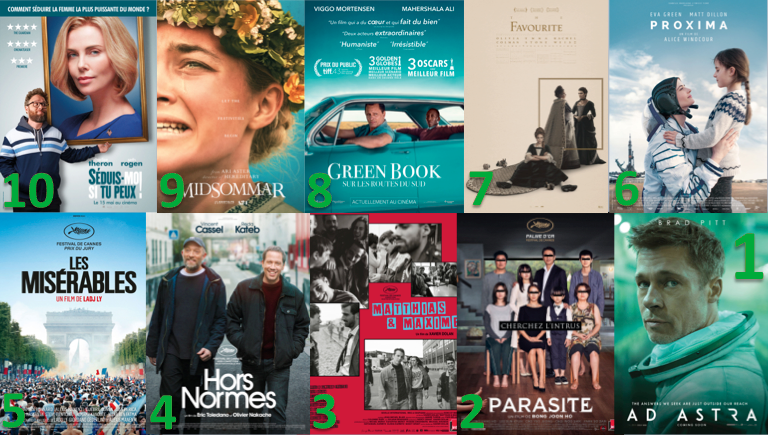 Vous pouvez commencer par admirer ce beau nuancier de bleu et vert, signe d’une année assez froide, qui n’aura sans doute pas été ma préférée de la décennie même si elle a réservé quelques beaux moments cinéma. En 10ème position, un film que je n’attendais pas et qui aura su me séduire. Le couple improbable formé par Seth Rogen et Charlize Theron fonctionne étonnement très bien. En plus d’être une bonne rom-com, Séduis-moi si tu peux est plutôt drôle. Changement d’ambiance radical avec Midsommar d’Ari Aster. Le nouveau prodige de l’horreur (déjà présent dans mon top 2018 avec Hérédité) nous plonge dans le doux enfer d’une communauté suédoise étrange. Difficile de savoir si on a aimé ou pas à la sortie de la salle, mais l’expérience est à vivre, et l’intro du film est une des meilleures (tout genre confondu) que j’ai pu voir. Oscar du Meilleur Film en début d’année, Green Book a reçu la critique d’être sans doute un peu facile, mais je crois qu’on oublie que ce n’est pas si facile de réussir un feel good movie. Peter Farrelly jongle à merveille entre comédie, drame social et même romance et révèle un savoureux Viggo Mortensen comique. Autre gagnant des derniers Oscars, Yorgos Lanthimos s’éclate avec son incroyable trio d’actrices dans La Favorite, un décapant et si moderne film en costumes qui fait la belle part aux femmes et aux émotions. Il prouve de nouveau qu’il faudra compter désormais sur lui dans les années à venir. Autre film féministe et intimiste, Proxima dévoile une Eva Green saisissante en mère astronaute. Alice Winocour livre un drame intérieur qui m’aura arraché de jolies larmes. Un coup de cœur de fin d’année.
