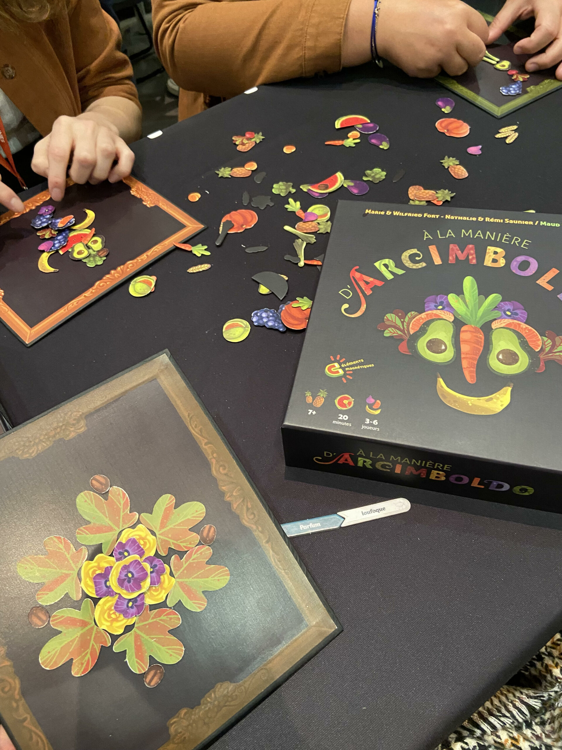 Découvert en espace presse, A la manière d’Archimboldo est un jeu destiné aux enfants dans lequel nous devons composer un tableau à l’aide d’éléments magnétiques. On tire au hasard un thème, une tenue enneigée, par exemple, et chacun pioche dans les magnets à la disposition de tous pour composer son œuvre. Pas de sablier, chacun prend le temps qu’il lui faut. Une fois que tous les joueurs ont terminé, chacun dévoile son tableau et l’explique puis nous procédons à un vote.