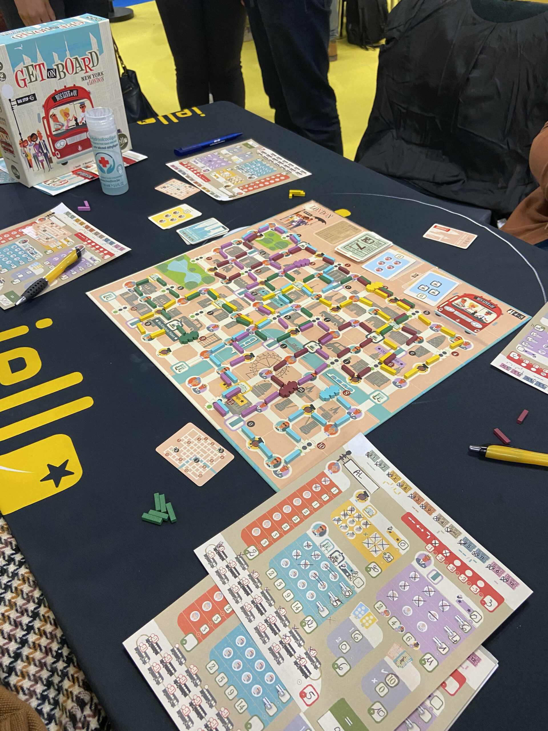 En alliant transport, roll & write et tons pastel, Get on Board ne pouvait que me plaire et ça n’a pas manqué. Nous voilà à Londres ou New-York (au choix, le plateau étant R°/V°) pour développer la meilleure ligne de bus possible, celle qui transportera la plus de passagers et qui évitera les bouchons (= éviter de trop croiser les lignes des autres joueurs, à 5, c’est compliqué).