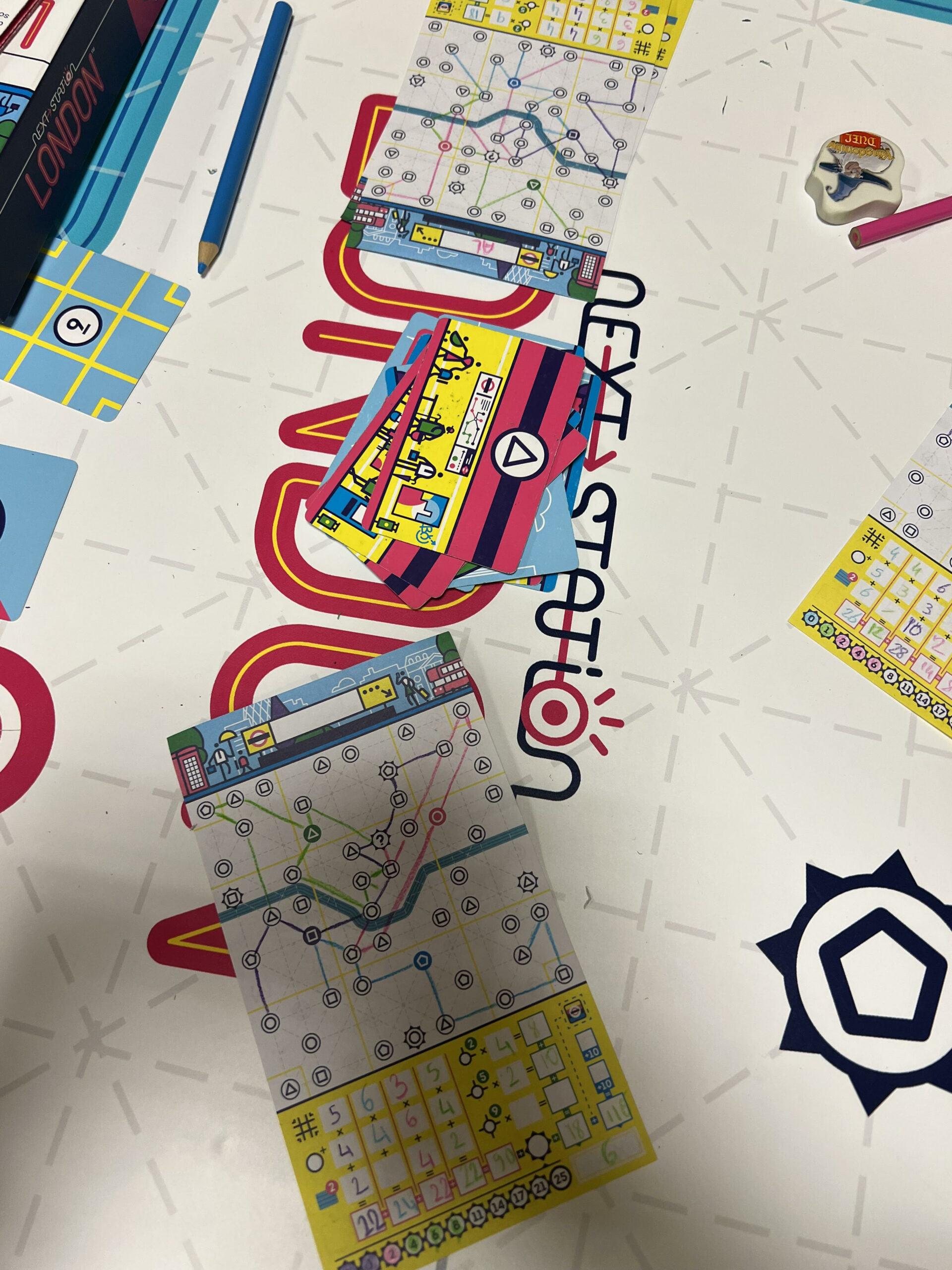 Mon véritable coup de cœur, le voici. Le drame, c’est que le jeu n’est pas encore en vente ni dispo à la précommande. Encore un jeu de transport, mais un draw & write cette fois. Il se déroule en 4 tours, à chaque tour, nous dessinons sur une map une ligne de métro d’une couleur, à la fin d’un tour, nous procédons à une phase de scoring (points pour le nombre de zones traversées, le nombre de fois où la Tamise a été traversée, etc…). Au tour suivant, changement de crayon de couleur et on démarre une nouvelle ligne avec la contrainte que les lignes ne doivent jamais se croiser.