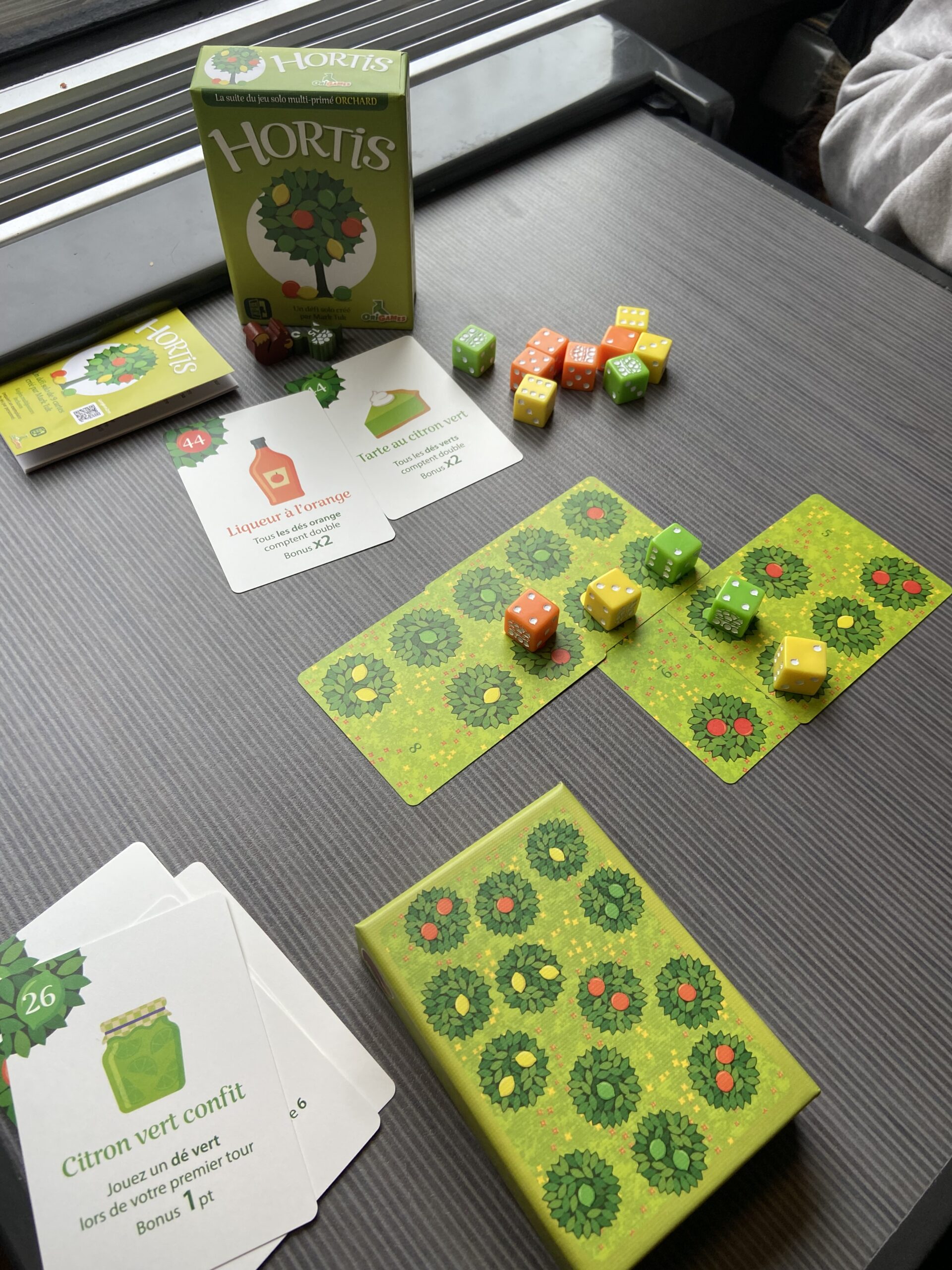 Acheté sur place et testé dans le train du retour, Hortis est un jeu solo dans lequel il vous faut optimiser le placement de vos cartes pour faire un maximum de points. Je ne suis pas du tout une adepte des jeux solo, mais les bons retours et les illustrations ont eu raison de mes réticences. Et c’est vraiment très bon, un casse-tête court et agréable. Nous l’avons testé en coop, et ça marche aussi très bien. Il est tout à fait possible d’y jouer à plusieurs (règles proposées), mais cela implique que chaque joueur dispose de sa propre boîte.