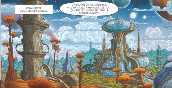 Visuellement, Prima Spatia est une claque. Silvio Camboni propose un dessin riche, aux lignes courbes et organiques, qui rappelle l’esthétique de Valérian et Laureline mais avec une touche très personnelle. L’espace ici n’est pas un vide noir et froid ; il est peuplé de récifs d’astéroïdes, de créatures hybrides et de vaisseaux aux designs incroyables.